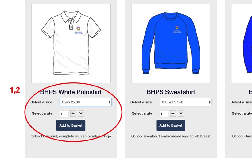 1. Scroll down, select size of your chosen item, then enter the quantity you require.